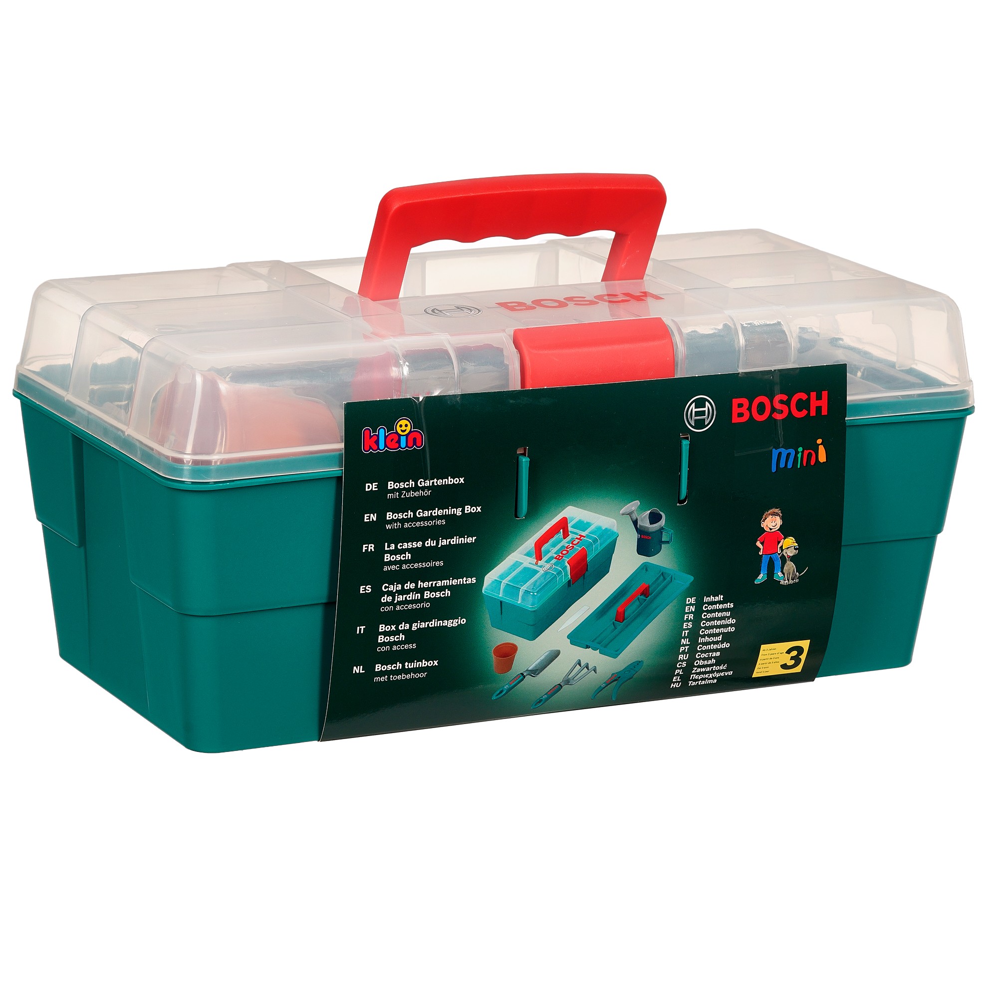 Здрав, стабилен и издръжливи – това е детския комплект от гамата градински инструменти на Bosch от Тео Клайн. В него се съдържа 1 бр. лопата, 1 бр. гребло, 1 бр. лозарска ножица, 1бр. лейка, 1 бр. саксия с пръчки за растения и инструкции за засаждане. Всичко това се побира в куфар с подвижна вложка, което улеснява съхранението на инструментите след края на играта. Поддръжка: Вижте инструкциите зададени от производителя