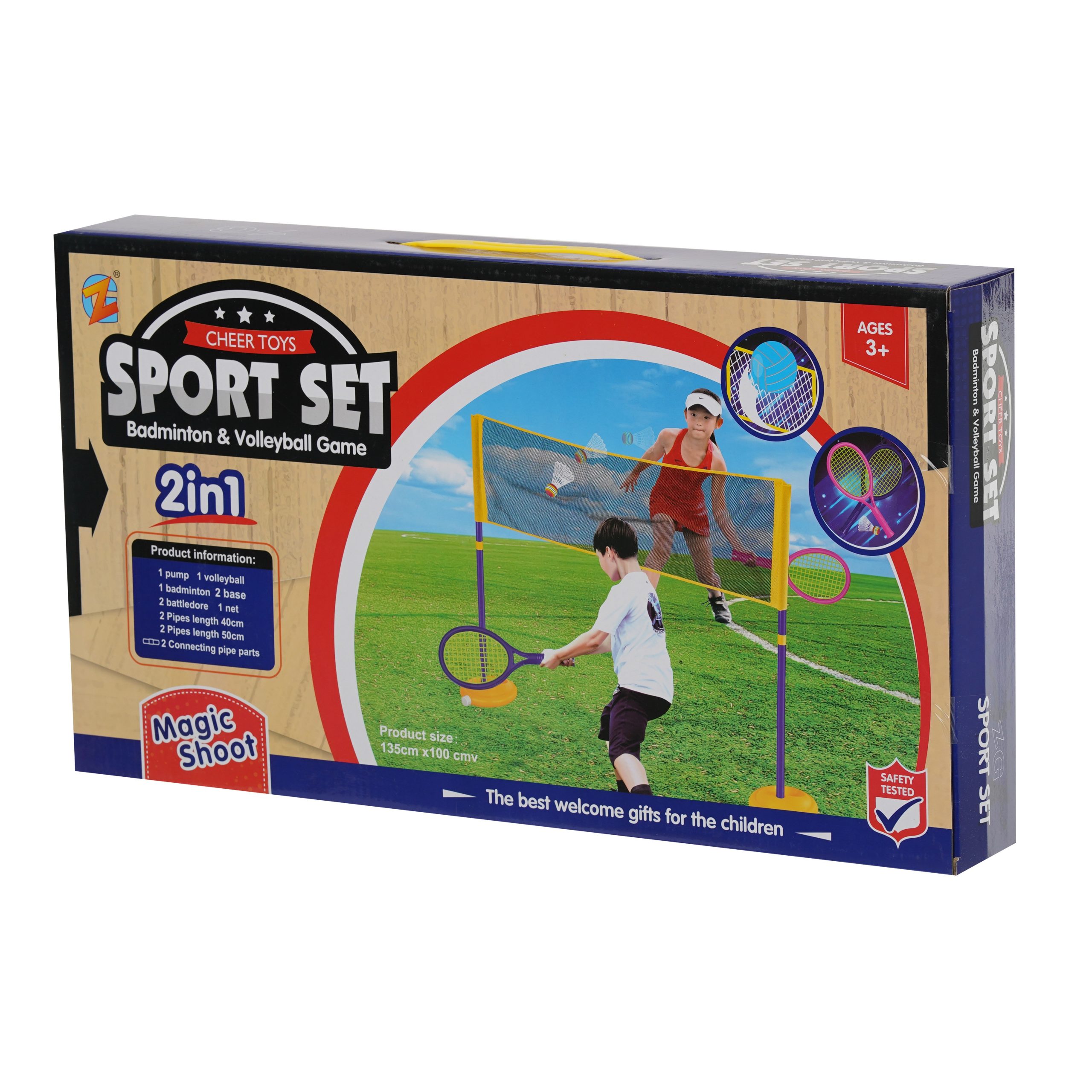 ?СПОРТЕН КОМПЛЕКТ 2 в 1 – бадминтон и волейбол, идеалният комплект за яздиш на открито за деца! Този многофункционален комплект ипа с всичко, от което детето ви се нуждае, за да играе както бадминтон, така и волейбол, което го прави чудесен июфди за всяко семейство._x000B_За бадминтон комплектът включва две хилки и топка, което позволява на децата да играят удобно както на закрито, така и на открито. И когато дойде време да преминете към волейбол, просто преобразувайте мрежата за бадминтон във волейболна мрежа с височина 1 m. Комплектът включва топка, помпа, мрежа, прътове и две основи, които могат да се пълнят с вода или пясък за допълнителна стабилност._x000B_Идеален за деца на възраст 3-5 години, нашият СПОРТЕН КОМПЛЕКТ 2 в 1 е безопасен и екологичен вариант за игра на открито. Всички части са направени без остри ръбове, а материалите са тествани с най-високи оценки за безопасност. Родителите могат да се присъединят към забавлението, което го прави чудесен начин да общувате с детето си._x000B_Изненадайте децата с перфектния летен подарък, нашия комплект 2 в 1 за бадминтон и волейбол! Не само е страхотен за двора, но е идеален и за забавен ден на плажа. Вашето дете може да се наслаждава на играта с други деца и възрастни, да развива двигателни умения и да остава активно, докато се забавлява.