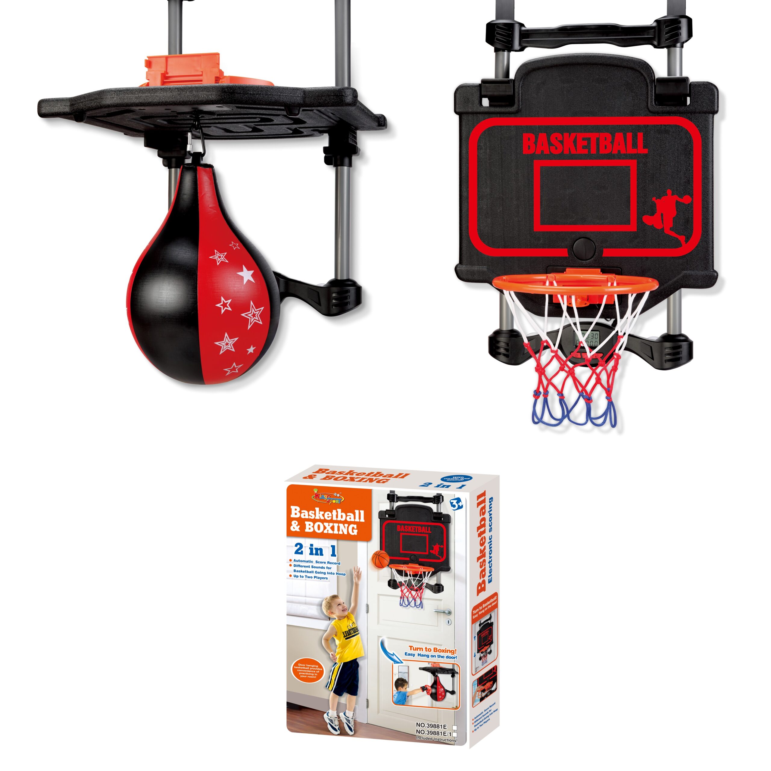 Комплектът съдържа: кош, топка, помпа, боксова круша Закупуването на детския спортен комплект е отлична възможност за създаване на условия за физическото развитие на деца на възраст от 3 до 8 години. Симулаторът се монтира лесно на рамката на вратата. Моделът е оборудван с електронно устройство, което показва броя на успешните хвърляния (със звуков ефект) на дисплея. Височината на окачването на крушата и баскетболния кош лесно се настройва спрямо височината на детето. Дизайнът се състои от основа с водачи и рафт върху въртяща се опора В повдигнато положение можете да закачите боксовата круша на рафта и да се занимавате с бокс, а в спуснато положение да хвърлите топката в баскетболен кош.