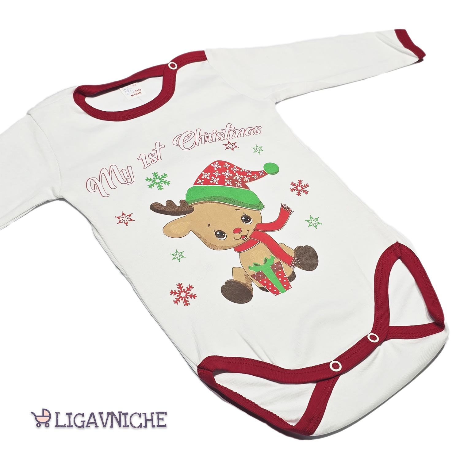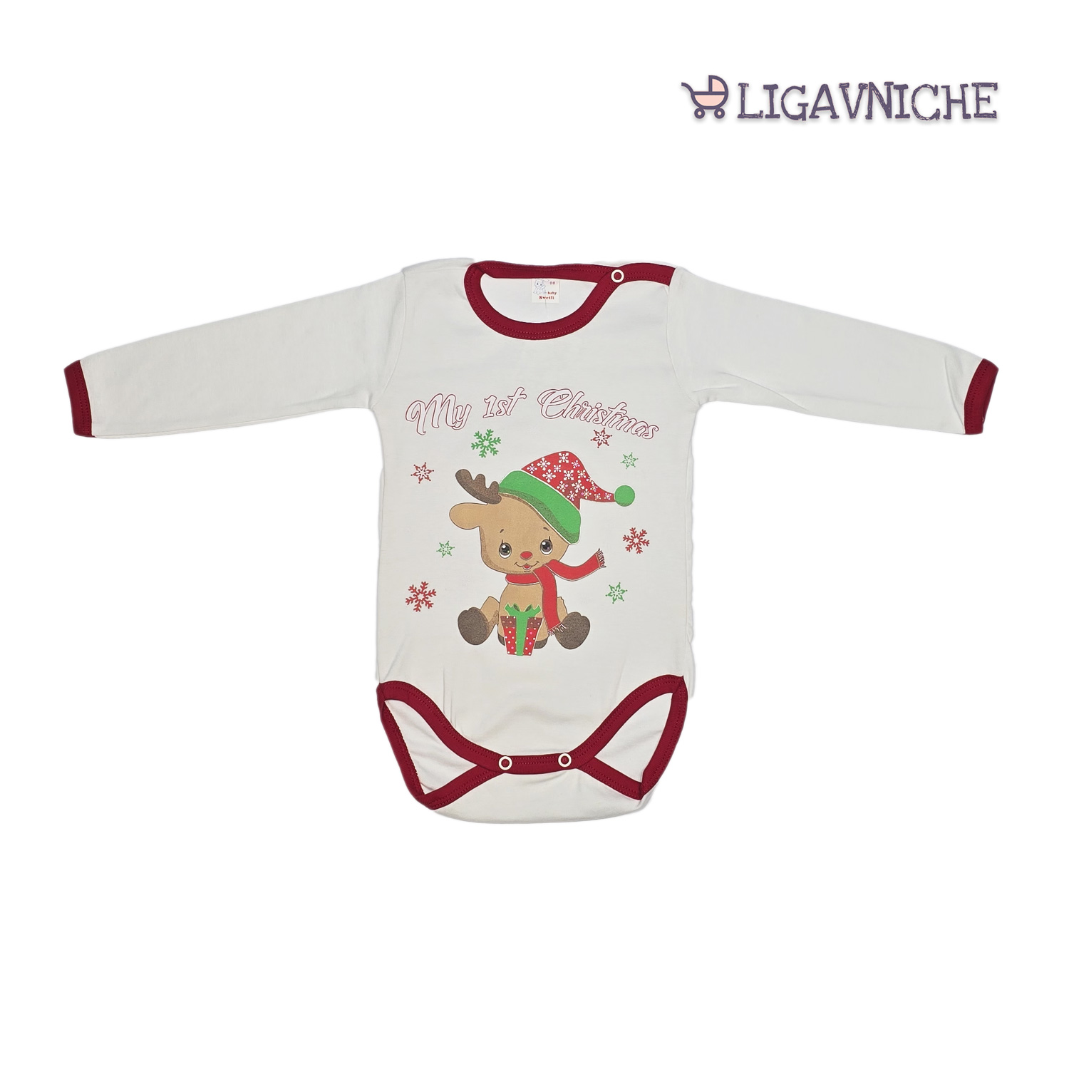 Създайте празнично настроение към облеклото на вашето мъниче с това коледно боди в бял цвят. Декорирано с нежна илюстрация на еленче с подарък, бодито е перфектно за семейни събирания и празнични моменти.